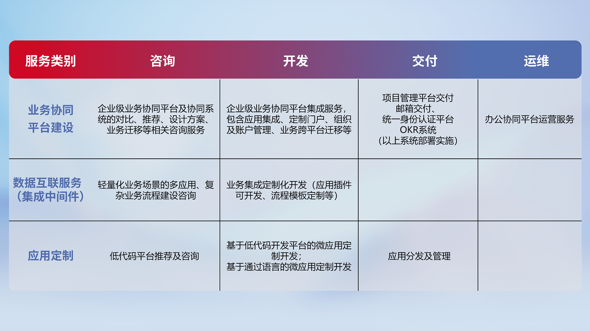 针对钉钉、、、、企微、、、、IDaas等平台级产品提供产品的规划、、、方案、、交付、、、、定制化开发等服务,,实现如统一协同办公、、、智能客户服务、、、、混合会议管理、、智能数据查询、、、等业务场景,,,,实现数字化转型。。。。